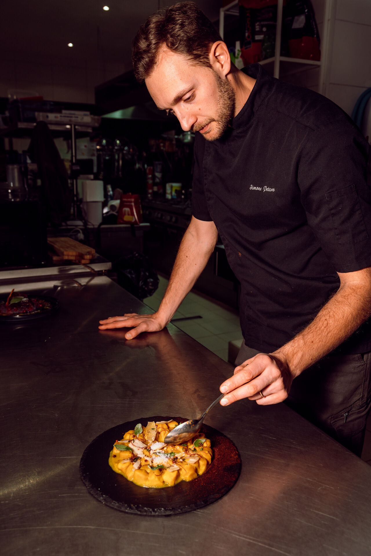 À la tête de la brigade composée de cuisiniers venu des Pouilles, le chef Simone prononcer Simoné Petaro apporte l’expérience acquise dans les restaurants étoilés.